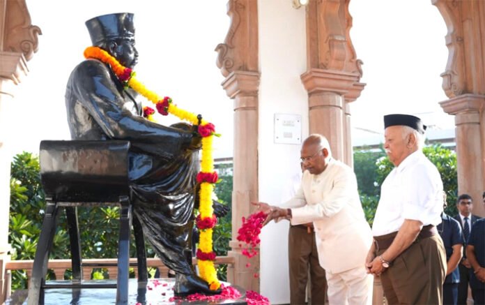 Earlier today, RSS Chief Mohan Bhagwat and former President Ram Nath Kovind performed Shastra Puja (worship of arms) at the RSS headquarters. On this occasion, Bhagwat also offered floral tributes to the statue of RSS founder Dr. K.B. Hedgewar.
